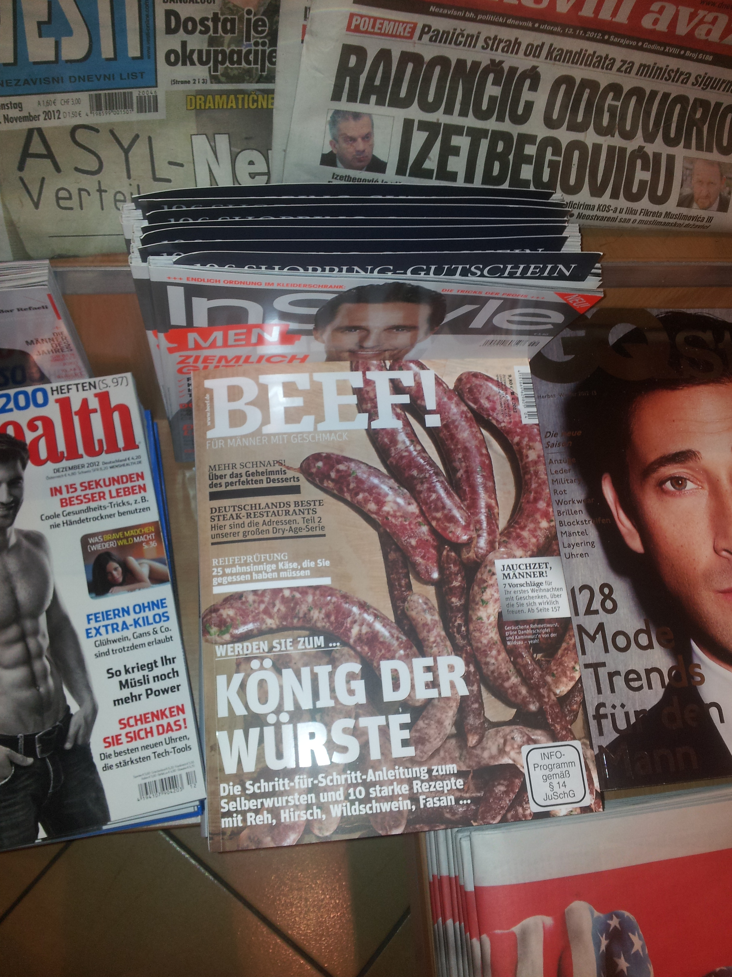 „Beef!“ Für Männer mit Geschmack. Die etwas andere Art der Fleischeslust. Auf dem Cover stramme Würstchen, im wahrsten Sinne des Wortes. Titelthema Nummer 1 „Werden Sie zum König der Würste“, die Schritt für Schritt Anleitung zum Selberwursten. Außerdem noch eine Reifeprüfung zum Probieren von 25 wahnsinnigen Käsesorten, die mann gegessen haben muss. Leider hatte ich keine Zeit mehr, mich in das 9,50 Euro Heft einzuarbeiten. Auf dem Weg zum Zug ließ mich das Wurstthema nicht mehr los. Welcher Mann könnte sich fürs Selberwursten interessieren? Was für Därme würde er verwenden? Die, aus selbst erlegten Tieren? Raus mit dem Darm, rein mit der Wurst? Würden sie irgendwelche High-Tech-Maschinen à la „Das perfekte Dinner“ verwenden, oder stopft mann noch per Hand? Und was fühlt er wohl dabei? Verarbeitung eines sexuellen Fetisch, oder verwurstet er imaginär seine Liebste ohne sich dabei strafbar zu machen? Oder vielleicht, nur ganz banal gedacht, will mann die Keule wieder haben?