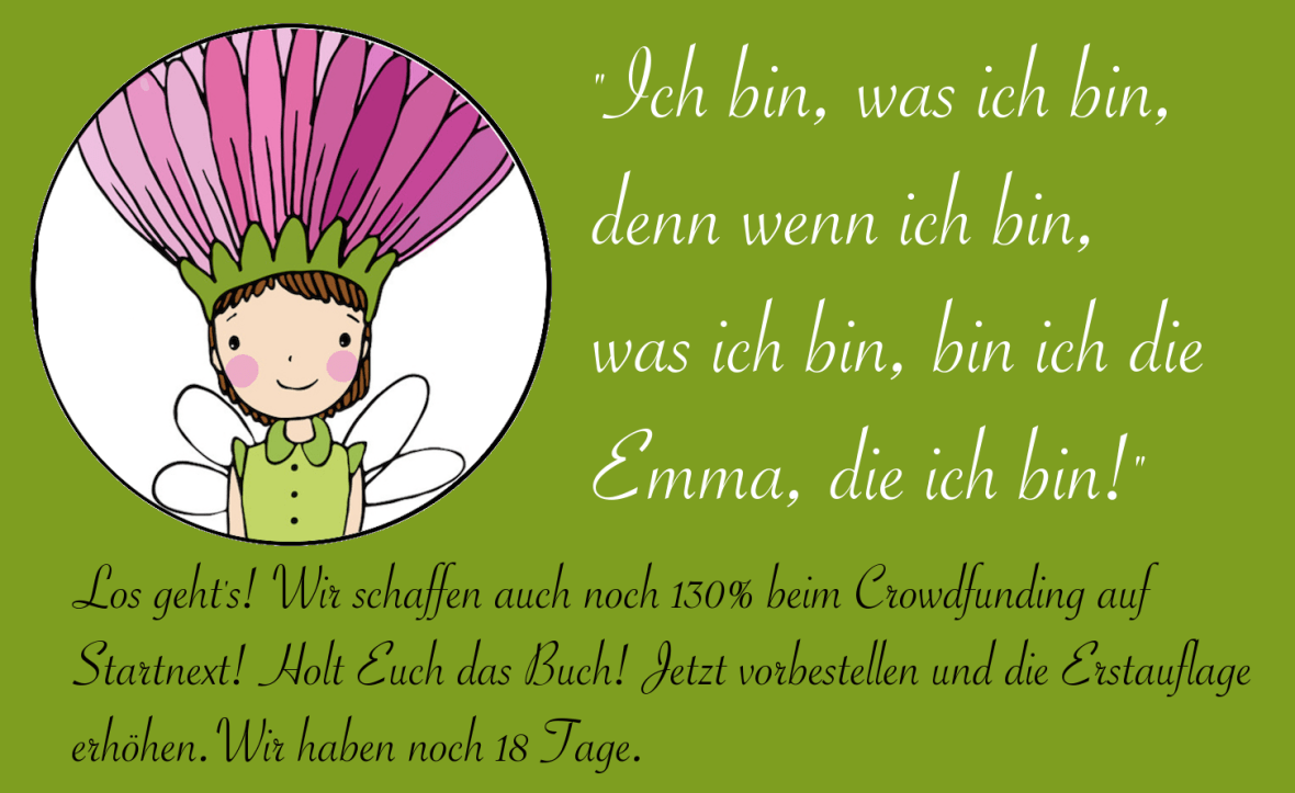 Die Ziellinie wurde bereits erfolgreich überschritten! „Emma´s Welt. Das Buch.“ wird gedruckt. Ihr habt noch genau 18 Tage Zeit euch ein Exemplar der Erstauflage zu sichern. Also schnell noch auf http://www.startnext.com/emmaswelt bestellen, bestellen, bestellen und Emmas Sicht der Dinge kommt zu euch!
